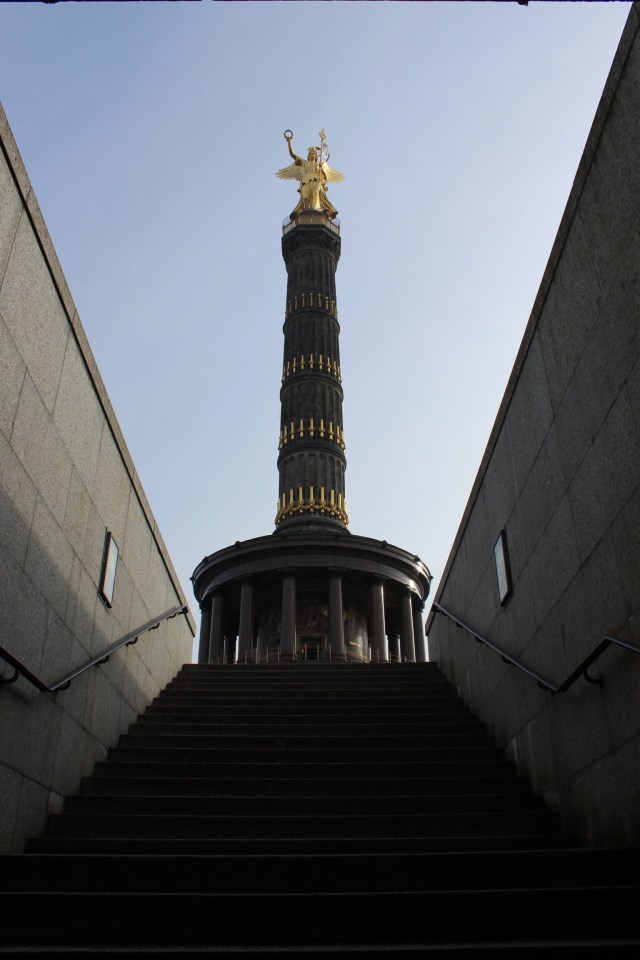 Um zur Siegessäule zu gelangen, gibt es 4 Tunneleingänge, denn diese befindet sich im Zentrum eines mehrspurigen Kreisverkehrs. Wir sind so früh dort, dass wir alleine die beeindruckende Säule genießen & erkunden können. Für 3 Euro p. P. kommt man über eine schmale Wendeltreppe bis ganz hoch unter die goldene Statue. Man hat eine tolle Sicht & kann das Brandenburger Tor sowie den dahinterliegenden Fernsehturm sehen. Hier verbringen wir ein paar Minuten & überlegen uns was wir als nächstes ansehen möchten.