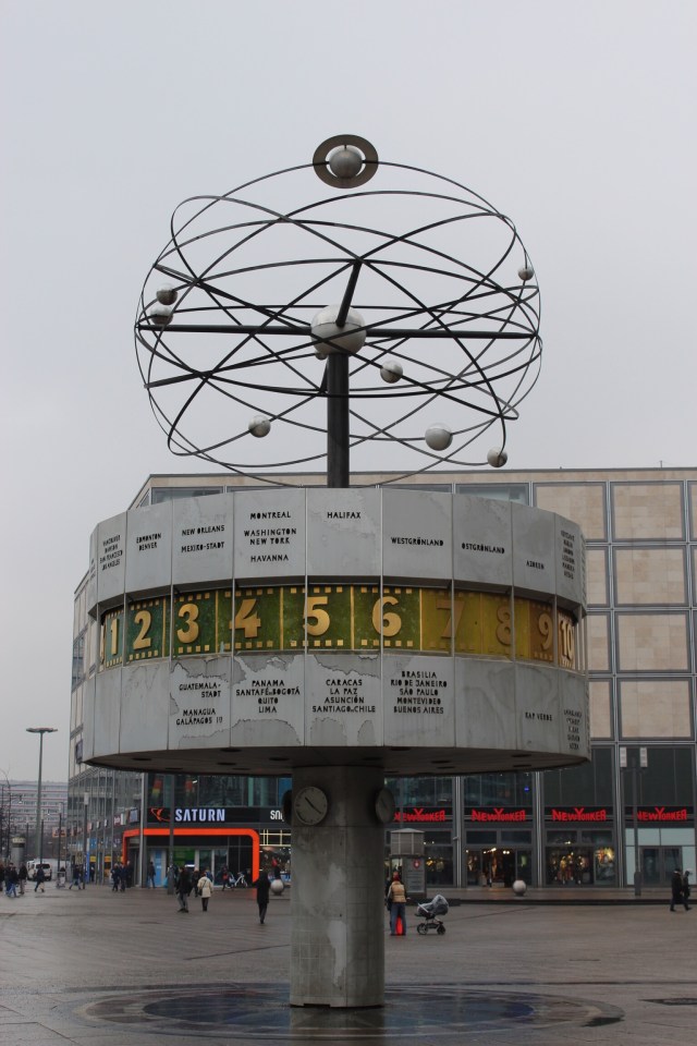 Für heute, Mittwoch, wollen wir eine Untergrundführung besuchen. Hierfür geht es vom Hotel eine gute halbe Stunde nach Berlin – Gesundbrunnen. Leider ist heute der Schirm & Regenkleidung mit dabei. Die Tickets gibt es immer nur vor Ort & für den selben Tag zu kaufen. Wir haben uns für die Tour „Dunkle Welten“ ,einer Bunker Tour, am späten Nachmittag entschieden. Nach dem Ticketkauf fahren wir zum Alexanderplatz um uns die Weltzeituhr anzusehen. Auf ihrer metallenen Rotunde befinden sich die Namen 148 Städte.